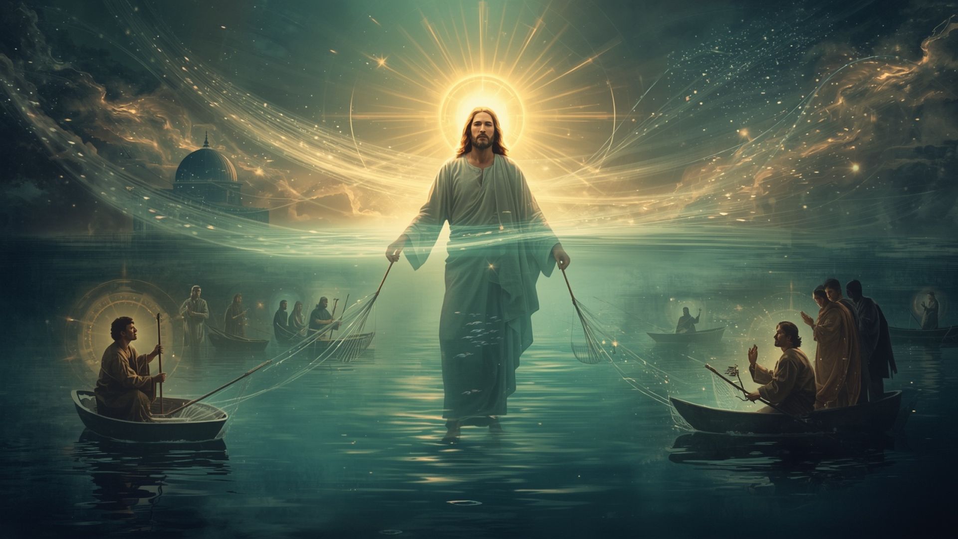 Um dia, estando Jesus à margem do lago de Genesaré, como a multidão de povo o comprimisse para ouvir a palavra de Deus — viu ele duas barcas atracadas à borda do lago e das quais os pescadores haviam desembarcado e lavavam suas redes. — Entrou numa dessas barcas, que era de Simão, e lhe pediu que a afastasse um pouco da margem; e, tendo-se sentado, ensinava ao povo de dentro da barca. Quando acabou de falar, disse a Simão: Avança para o mar e lança as tuas redes de pescar. — Respondeu-lhe Simão: Mestre, trabalhamos a noite toda e nada apanhamos; contudo, pois que mandas, lançarei a rede. — Tendo-a lançado, apanharam tão grande quantidade de peixes, que a rede se rompeu. — Acenaram para os companheiros que estavam na outra barca, a fim de que viessem ajudá-los. Eles vieram e encheram de tal modo as barcas, que por pouco estas não se submergiram. (S. Lucas, 5:1–7.)