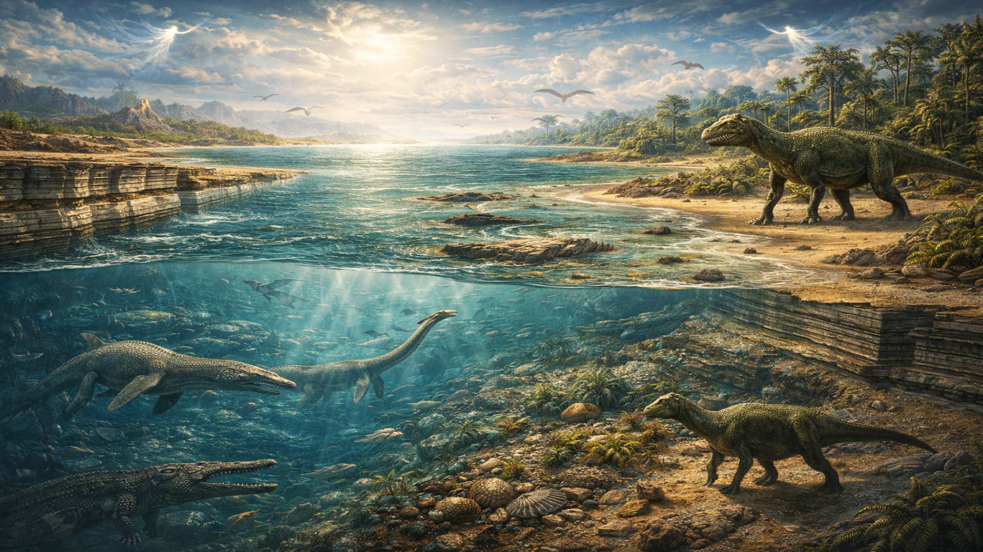 O ictiossauro, espécie de peixe lagarto que chegava a ter 10 metros de comprido e cujas mandíbulas, prodigiosamente alongadas, eram armadas de 180 dentes. Sua forma geral lembra um pouco a do crocodilo, mas sem couraça escamosa. Seus olhos tinham o volume da cabeça de um homem; possuía barbatanas como a baleia e, como esta, expelia água por aberturas próprias para isso.