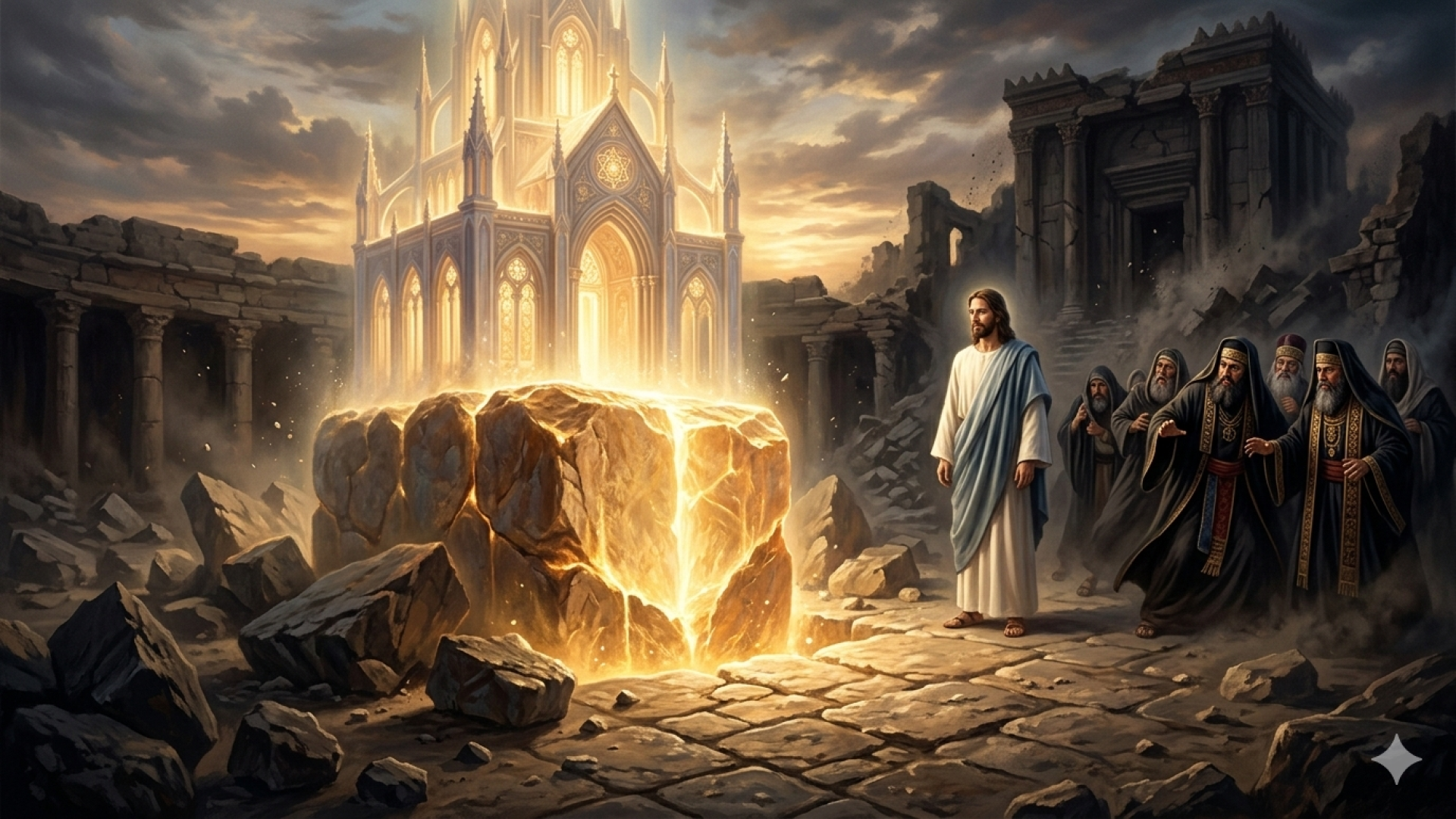 - A palavra de Jesus se tornou a pedra angular, isto é, a pedra de consolidação do novo edifício da fé, erguido sobre as ruínas do antigo. Havendo os judeus, os príncipes dos sacerdotes e os fariseus rejeitado essa pedra, ela os esmagou, do mesmo modo que esmagará os que, depois, a desconheceram, ou lhe desfiguraram o sentido em prol de suas ambições.
