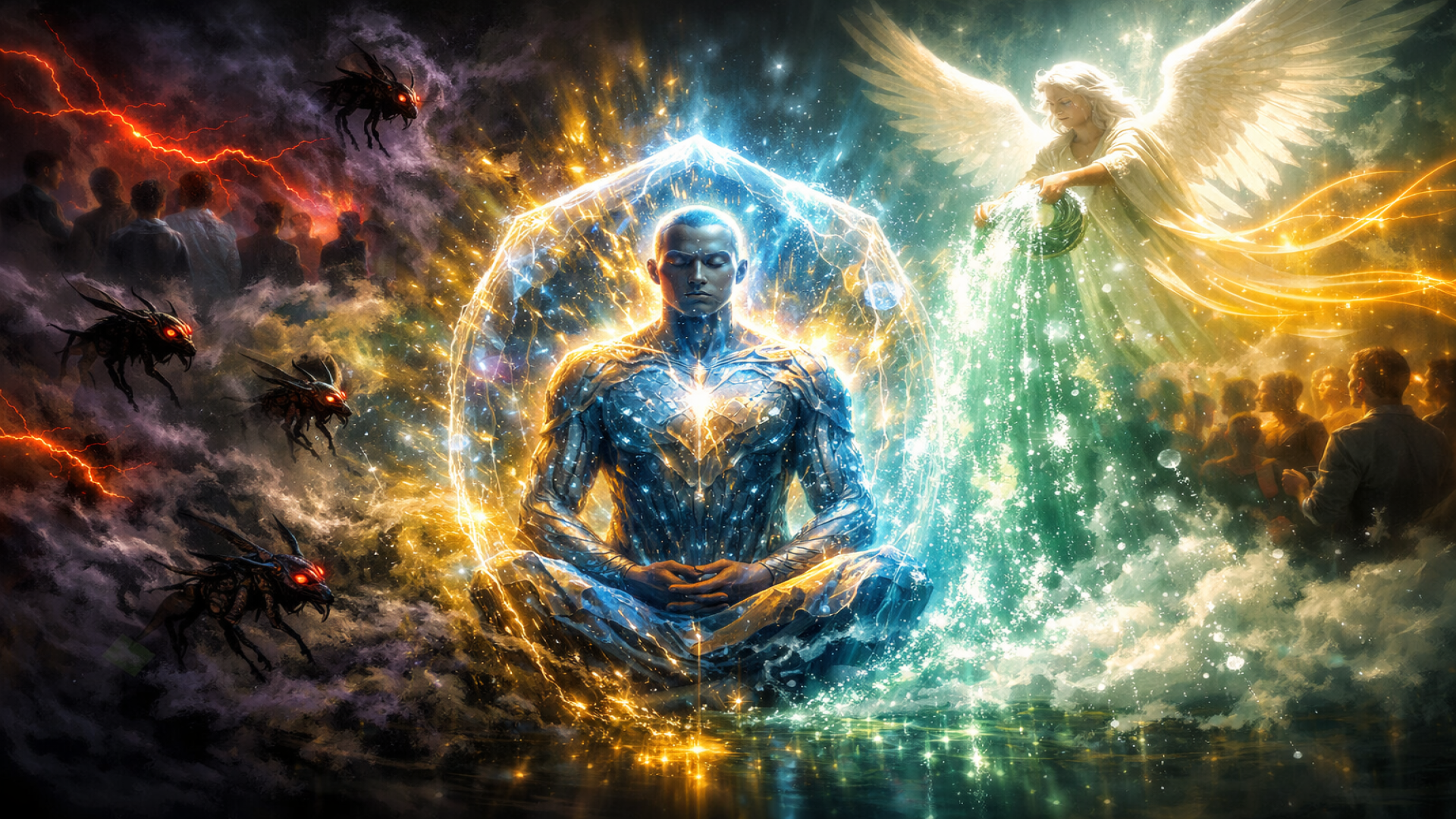 O pensamento do encarnado atua sobre os fluidos espirituais, como o dos desencarnados, e se transmite de Espírito a Espírito pelas mesmas vias e, conforme seja bom ou mau, saneia ou vicia os fluidos ambientes.
