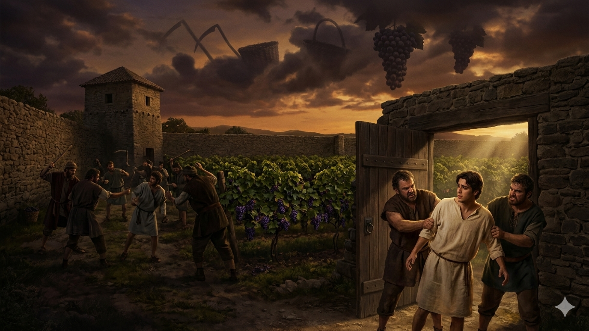Havia um pai de família que, tendo plantado uma vinha, a cercou com uma sebe e, cavando a terra, construiu uma torre. Arrendou-a depois a uns vinhateiros e partiu para um país distante. — Ora, estando próximo o tempo dos frutos, enviou ele seus servos aos vinhateiros, para recolher o fruto da sua vinha. — Os vinhateiros, apoderando-se dos servos, deram num, mataram outro e a outro apedrejaram. Enviou-lhes ele outros servos em maior número do que os primeiros e eles os trataram da mesma maneira. — Por fim, enviou-lhes seu próprio filho, dizendo de si para si: Ao meu filho eles terão algum respeito. — Mas os vinhateiros, ao verem o filho, disseram entre si: Aqui está o herdeiro; vinde, matemo-lo e ficaremos donos da sua herança. — E, com isso, pegaram dele, lançaram-no fora da vinha e o mataram. — Quando o dono da vinha vier, como tratará esses vinhateiros? — Responderam-lhe: Fará que pereçam miseravelmente esses malvados e arrendará a vinha a outros vinhateiros, que lhe entreguem os frutos na estação própria.