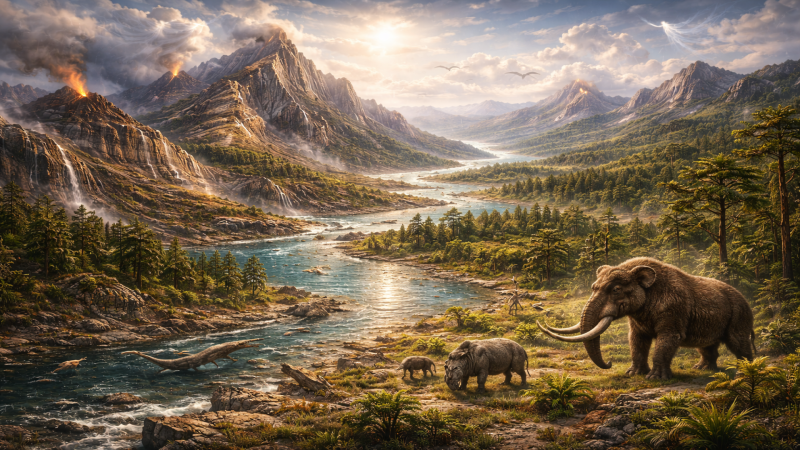 Período pós-diluviano ou atual. Nascimento do homem. 48. Uma vez restabelecido o equilíbrio na superfície do planeta, prontamente a vida vegetal e animal retomou o seu curso. C...